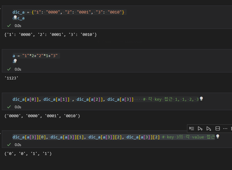 dic_a[a[0]], dic_a[a[1]] , dic_a[a[2]], dic_a[a[3]] # 각 key 접근 1, 1, 2, 3
