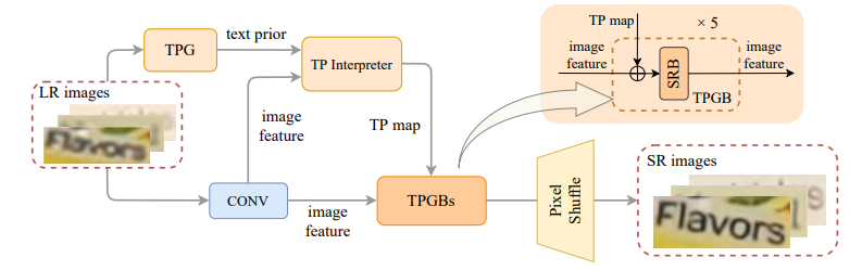 - TP map $f_{TM}$과 image features $f_{I}$를 점진적으로 융합하는 5개의 TPGB(Text Prior Guided Block)와 해상도를 높이는 최종 Pixel Shuffle 레이어가 포함됨