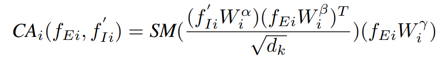 - $f_{E}$와 $f'_{I}$의 i번째 그룹에 대해 cross attention 연산 $CA_{i}$가 수행됨