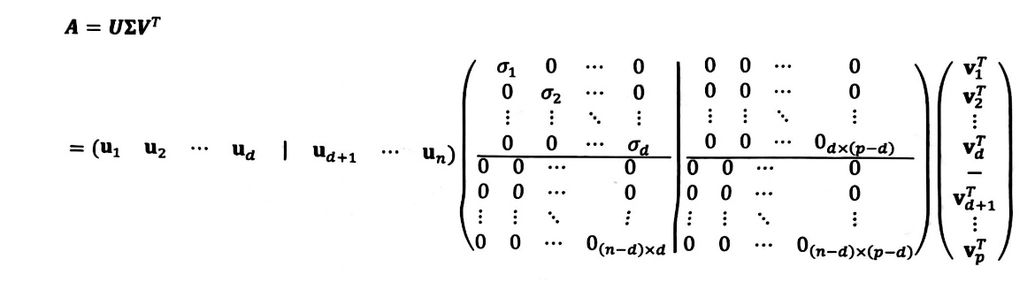 2. 행렬 $A$가 $p$차원이라 했을 때, $A$를 $d$차원 $(p>d)$로 축소한 행렬을 $B$라고 하면, 특이값 분해는 차원 축소 행렬 $B$를 찾는데 사용하며 $d$차원은 직접 정할 수 있음