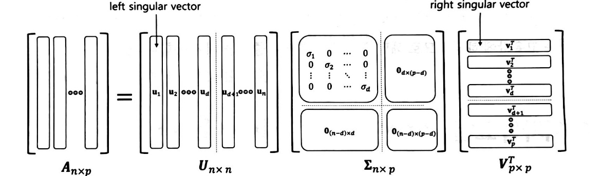 - 특이값 분해 공식 : $A = U \Sigma V^{T}$