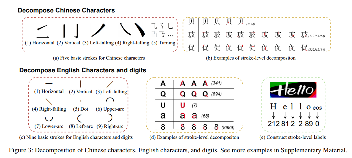 각 문자를 스트로크 시퀀스로 분해하고 영어 문자, 숫자 및 중국 문자에 대한 스트로크 수준의 텍스트 라벨을 구성한다.
