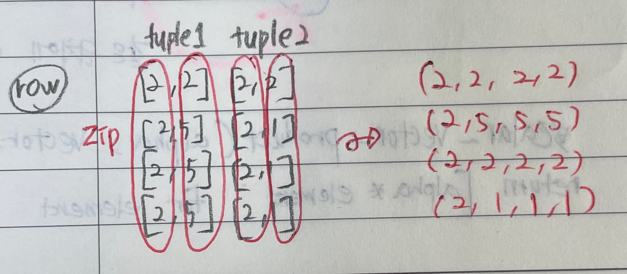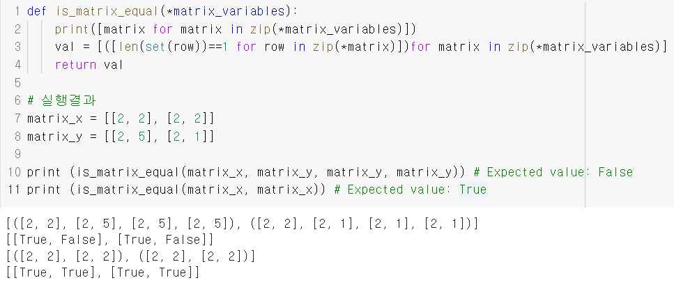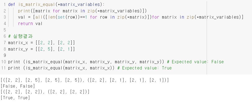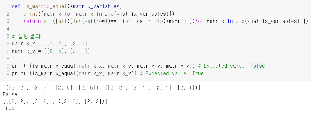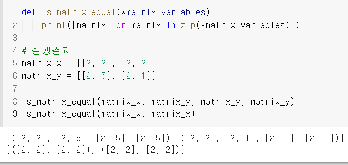 위 코드에서 두번째 행 코드는 매개변수 *matrix_variables로 들어온 값들을 같은 위치에 있는 것들을 튜플 형태로 출력하여 준다. [그림 1]을 보면 같은 위치의 값들을 뽑아 튜플 형태로 출력하는 것을 확인할 수 있다.