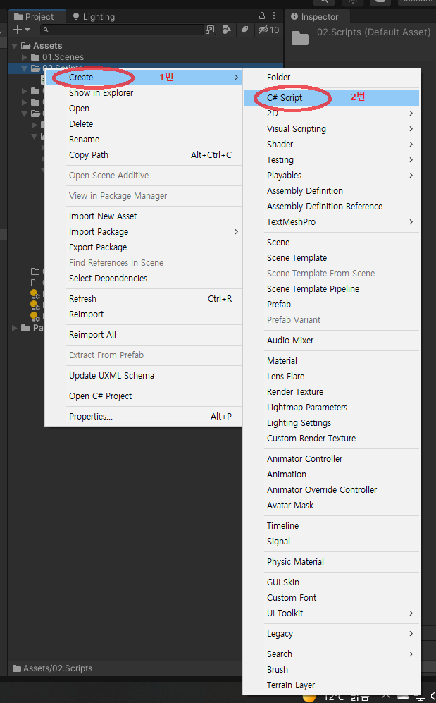 그 후에 마우스 오른쪽을 클릭하면 Create가 뜬다. Create > C# Script 순으로 누르면 C# Script가 생성된다.