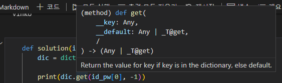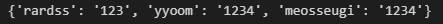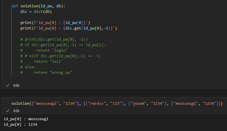 dictionary dic에서 id_pw[0]에 해당하는 meosseugi 키는 값을 가지고 있으므로 가지고 있는 값인 1234를 반환한다.